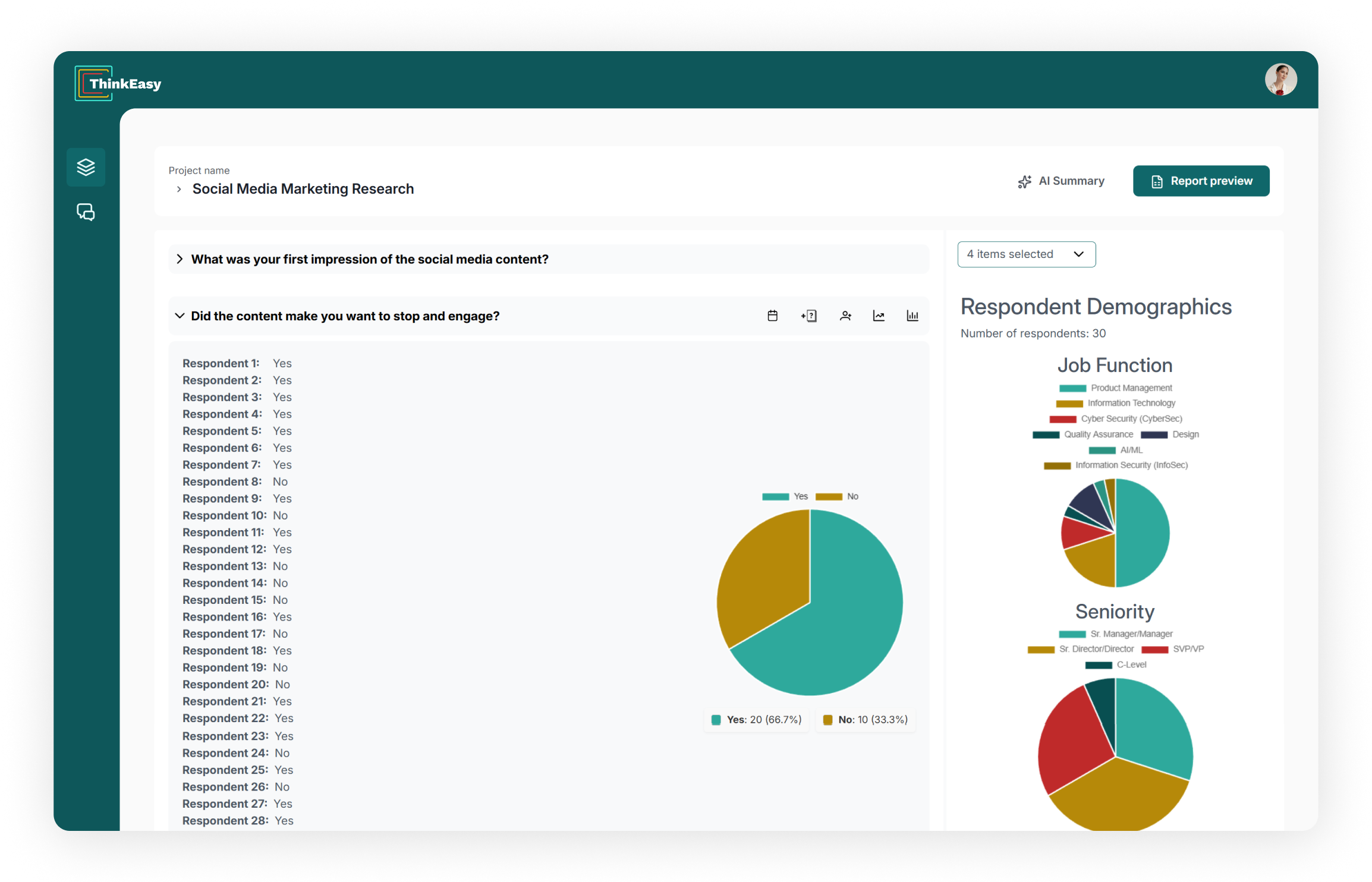 With ThinkEasy, it's easier than ever to get feedback from your ICP. Learn more about our vetted and verified audiences and our fraud-free guarantee.